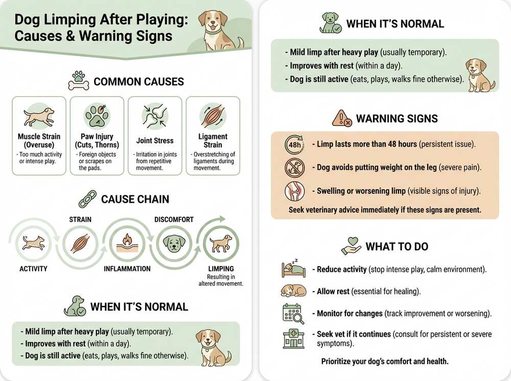 - Dog limping after playing often happens due to muscle strain, overuse, or a minor paw injury. If the limp started after longer activity like running, see why is my dog limping after running. If it happened after a jump or landing, see dog limping after jumping.