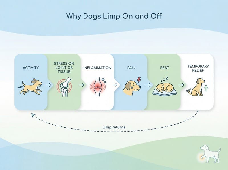 A dog limping on and off usually means the problem is mild, recurring, or not fully healed. Symptoms improve with rest but return during activity.