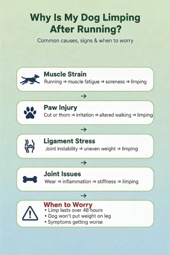 This visual explains why a dog may limp after running, including muscle strain, paw injury, ligament stress, or joint issues.