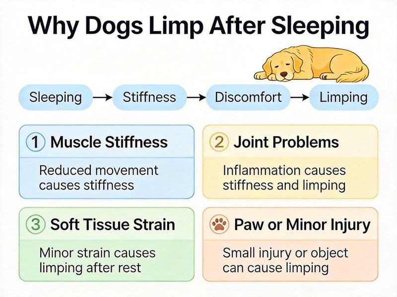 Dog limping after sleeping is often linked to stiffness, minor strain, or joint issues. It can happen when a dog rests for a long time and then starts moving again.